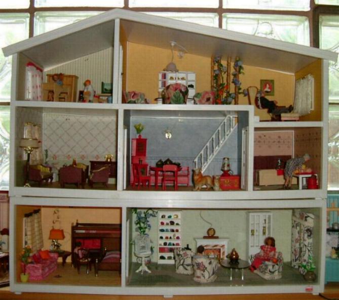 Mein neues Lundbyhaus, das Gehäuse gibt es heute noch zu kaufen, die Möbel sind aus den 70er und 80er Jahre, das Geländer im oberen rechten Zimmer fehlte, ich habe es durch gedrechseltes Holz ersetzt. Die einzelne Zimmer können durch anklicken vergrößert werden.