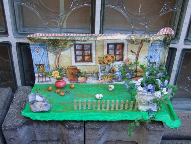 Nachdem ich diesen Firstziegel gefunden habe, dachte ich, den kann man doch nicht einfach wegwerfen. Der hintere Teil ist Serviettentechnik, der Boden bemalt.